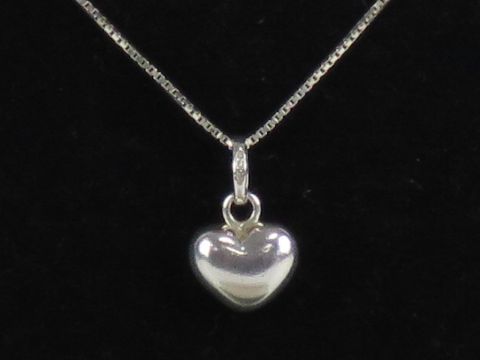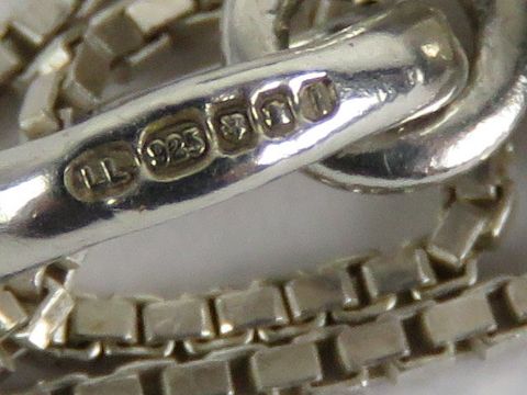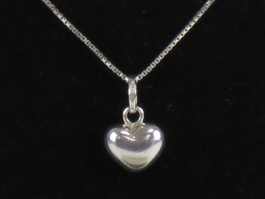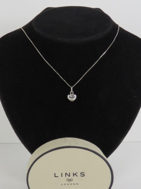 Links of London; a HM silver heart shaped pendant having links of London mark upon, with 925 silver box link chain, within presentation box.