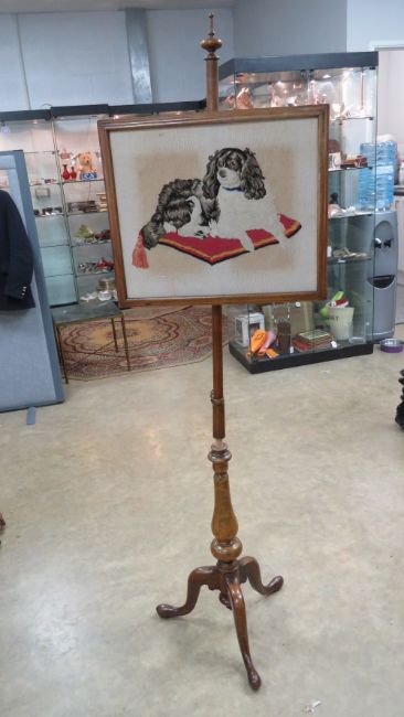 A tripod adjustable pole screen in two sections having having needlepoint panel depicting recumbent spaniel, all standing 166cm high.