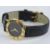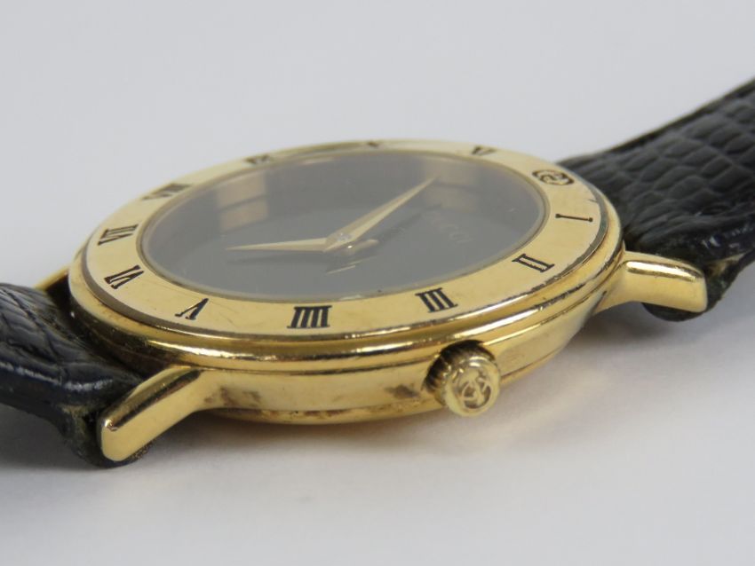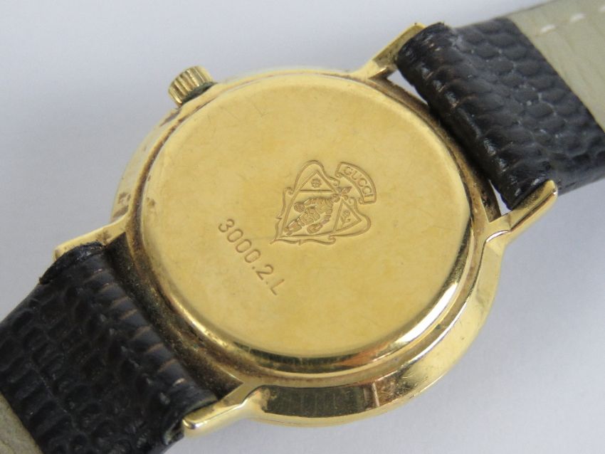 Gucci; a ladies wristwatch having black dial with gold plated chapter ring, marked 3000.2.L to back and marked Gucci to dial, chapter ring, crown wheel and case back. On a black 'lizard grain' strap.
