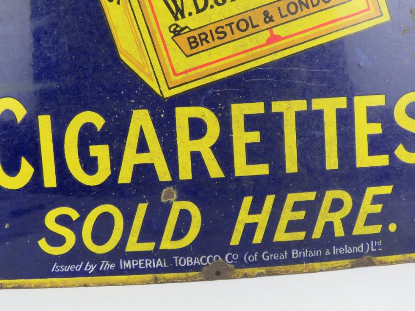 A vintage enamelled tinplate advertising sign 'Wills's Wild Gold Flake Cigarettes', measuring 92 x 60cm.