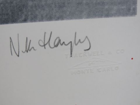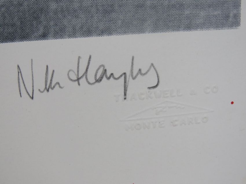 A pair of fine quality Ferrari themed colour prints from paintings by Roy Nockolds, being the French Grand Prix 1953, 75 x 55cm, and the Belgian Grand Prix 1961 Works Ferraris, 75 x 55cm. Both bearing embossed mark for Thackwell & Co Monte Carlo. In frames, one glazed.