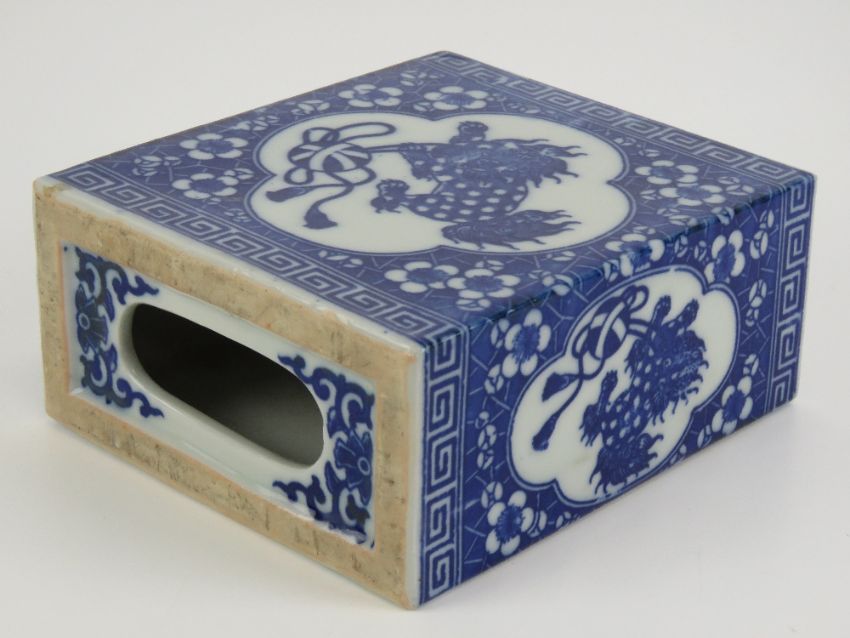 A late 19th / early 20th century opium den ceramic pillow of typical brick form with coin style piercing to one end and open to the reverse, underglaze blue Fo dogs and floral decoration, 14.5 x 13 x 6.5cm.