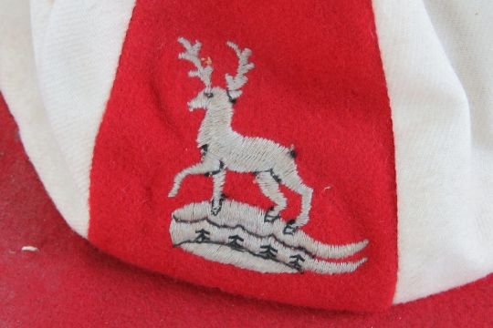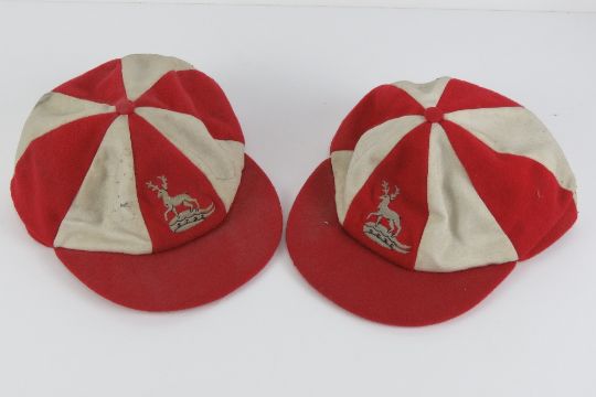 A pair of Harrods red and white peaked team chase caps, each bearing a Stag upon.