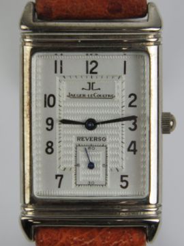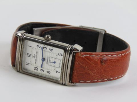 A c1990s Jaeger Le Coultre stainless steel Reverso quartz wristwatch, rectangular white dial with subsidiary seconds dial, backplate No.96001, tan leather strap.