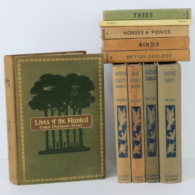 Book; Ernest Thompson Seton 'Lives of the Hunted, Containing a True Account of the Doings of Five Quadrupeds and Three Birds and, in Elucidation of Same, over 200 Drawings', published by Charles Scribner's Sons, 1901. First Edition. Hardcover in pictorial olive green cloth decorated in gilt, black, and brown, spine sunned, no dust jacket. Together with a quantity of Abbey Nature books and Observers guides.
