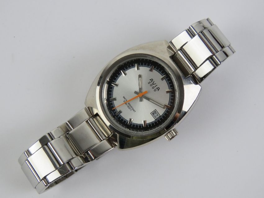 An Avia 2000 stainless steel wristwatch 'as new' with plastic film to case back, in presentation box. Having stainless steel dial with date aperture.