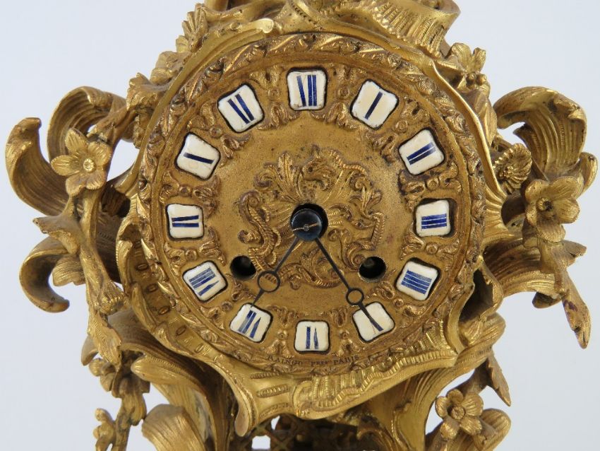 A superb gilt brass 19th century Continental mantle clock by E Pannard having hand painted ceramic hour cabachons and profusely pierced and decorated with twin figures and foliate and floral decoration throughout, 40cm high.