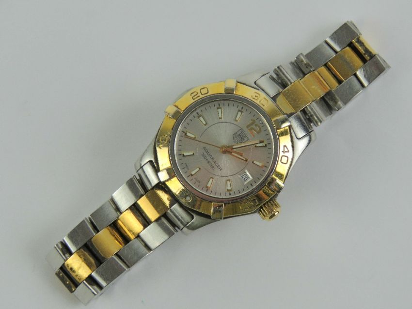 A Tag Heuer ladies stainless steel Aquaracer wristwatch model WAF 1420, on original Tag Heuer stainless steel bracelet strap, silvered dial with date aperture and luminous markers.