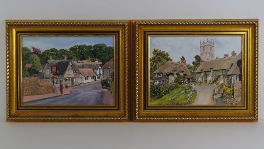 A pair of contemporary oil on board paintings of village scenes, each signed S Johnson and measuring 28.5 x 21cm.