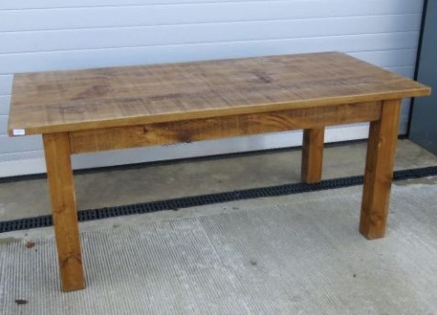 A contemporary solid pine kitchen table raised over substantial square cut legs, 6ft x 3ft.