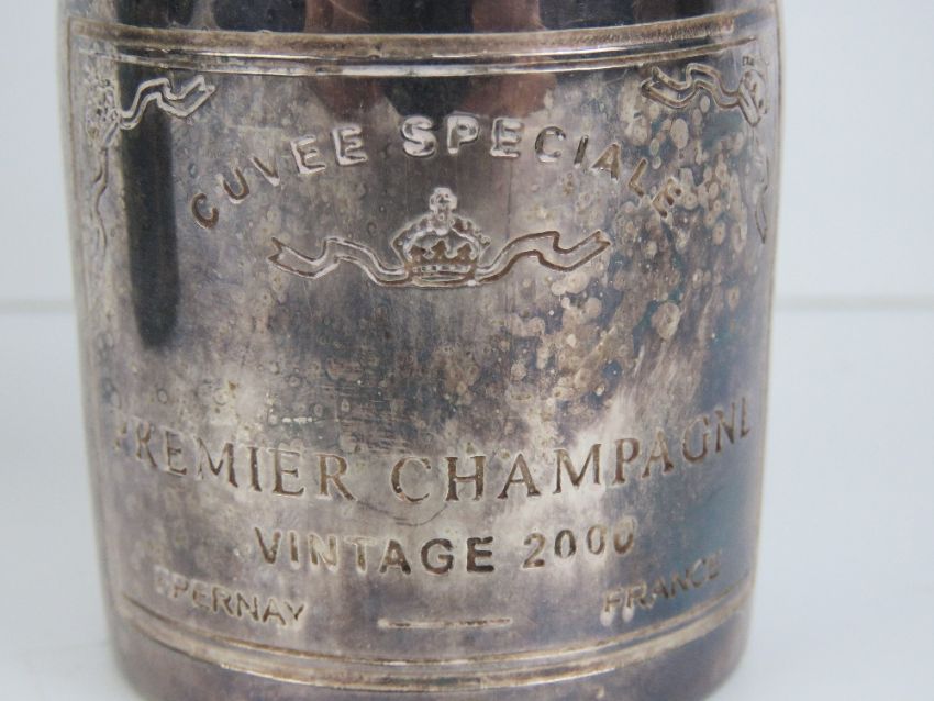 A pair of miniature silver plated champagne bottles by Parks of London, dated 2000 Millennium Edition, each unscrewing to reveal integral scented candle within, 17cm high. Each complete with dust bag.