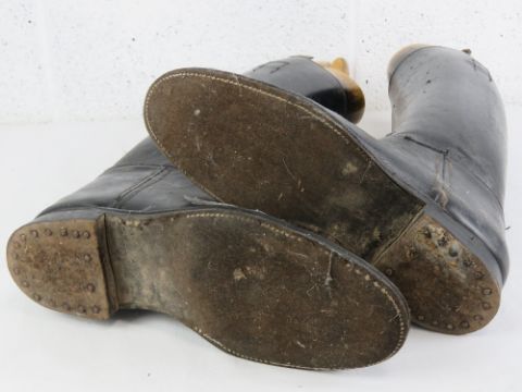A pair of black leather riding boots, having interior finger pulls, three sectional beechwood trees, marked for Horace Batten to boots and trees. 11" heel to toe, internal circumference at top approx 13.5", height at back approx 18".