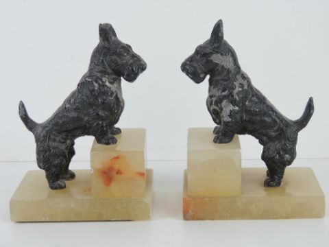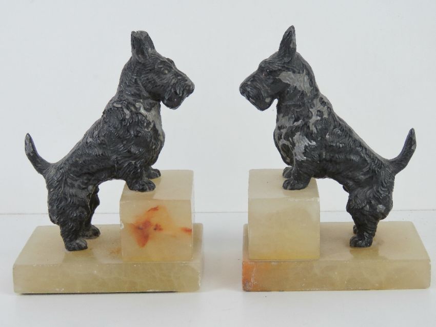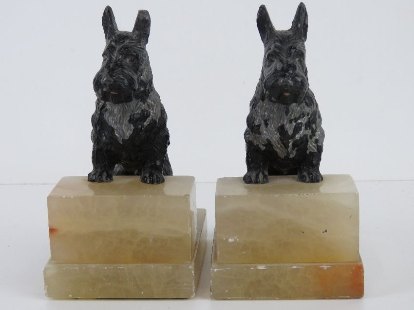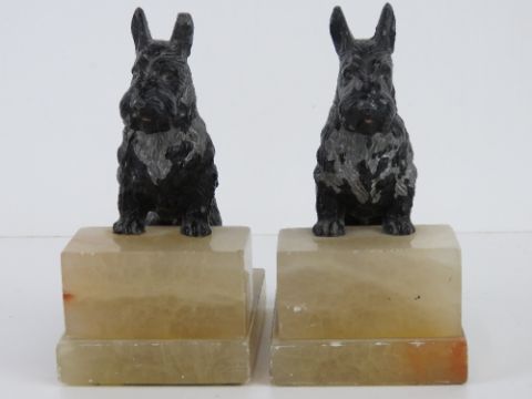 A pair of Scotty dog bookends, each raised over square shaped white onyx stepped base, 16cm high.