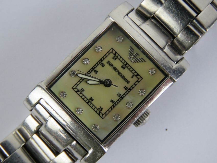 A ladies Emporio Armani wristwatch having original stainless steel Emporio Armani bracelet strap.