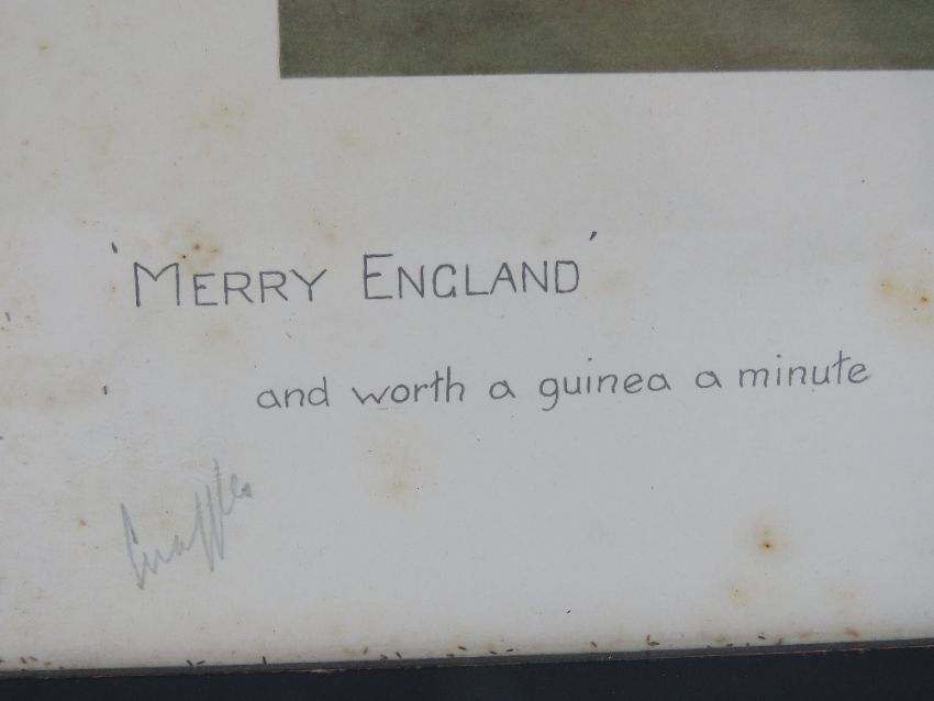 Snaffles Print; 'Merry England and worth a Guinea a minute' depicting Huntsman of Grey on an English day, signed in pencil Snaffles lower left and embossed with the Snaffles bit, 39 x 36cm.