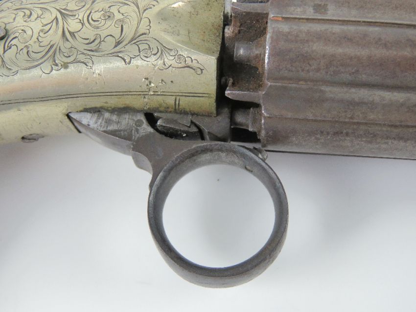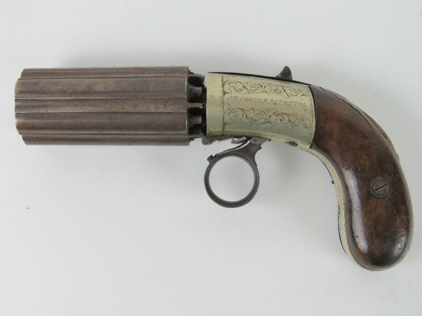An antique British Cooper Pepperbox .38 calibre pistol. Barrel lock safety and under hammer design. The trigger return spring is not functioning. Antique obsolote calibre, no licence required. Footnote: Joseph Rock Cooper made guns from the mid 1850's until his death in 1863. He was located in Birmingham and was responsible for many innovative firearms patents. The Pepperbox pistol first appeared in the 1830s and was the first mass produced multi shot pistol that could be fired with one hand. It was obsolete by the 1850s, when the first true revolvers started to make an appearance. However, they continued to be used until the 1870s.