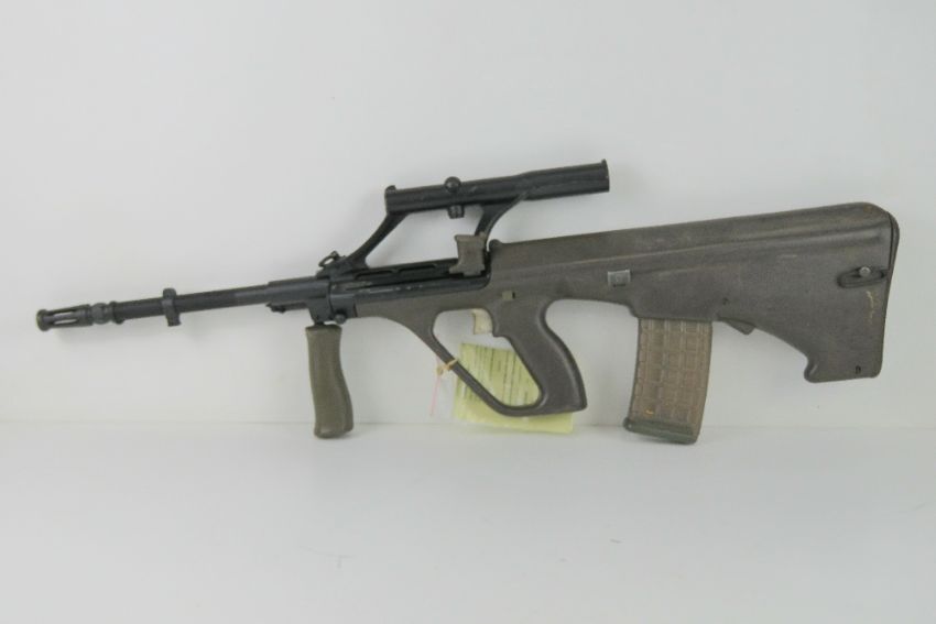 A deactivated Steyr AUG 5.56mm Assault Rifle with optical sight, moving trigger, safety, cocking handle (under spring pressure, and removable mag. With certificate.