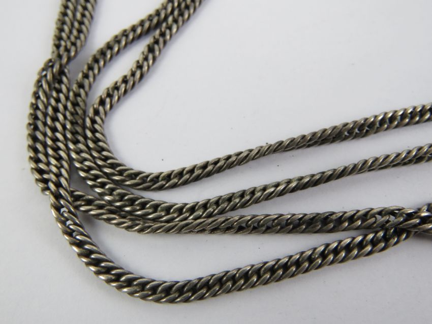 A long white metal guard chain having clasp to one end, 78.5cm in length, 37.9g.