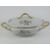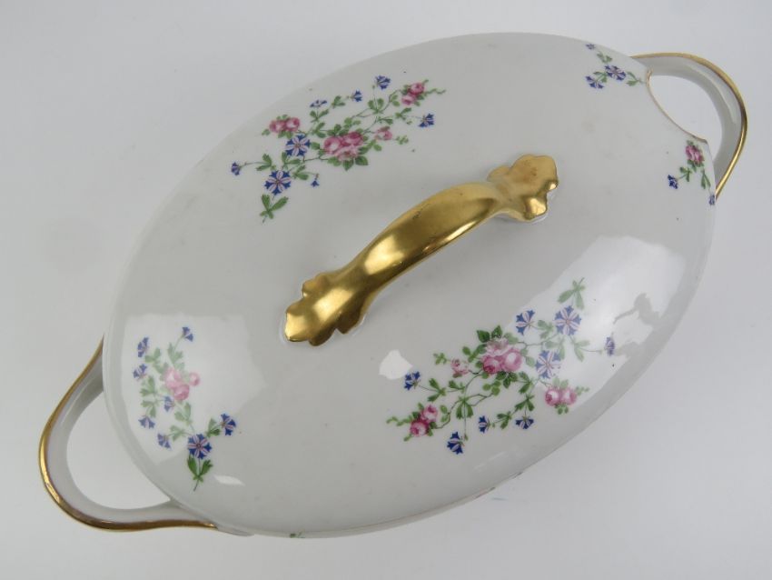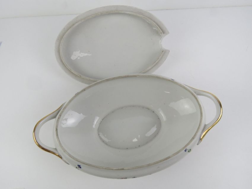 A French lidded turn having white ground with delicate pink and blue floral decoration upon, gilded handles, 37cm wide.