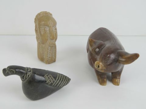 A carved stone pig figurine, 14cm in length, together with two other carved stone figurines.