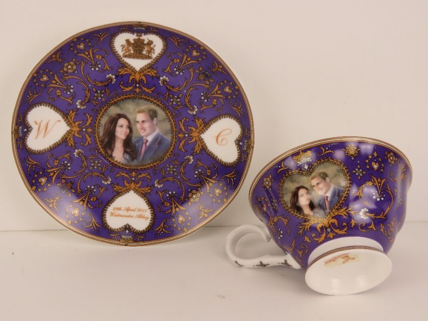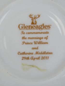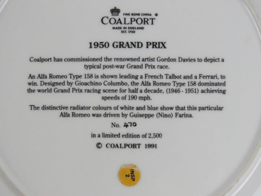 1950 Grand Prix; a Coalport decorative plate designed by Gordon Davis, featuring an Alfa Romeo Type 158 driven by Guiseppe (Nino) Farina leading a French Talbot and a Ferrari, No 470 of 2500, 27cm dia. Together with a Gleneagles commemorative cup and saucer and a Wedgwood clock. Three items.