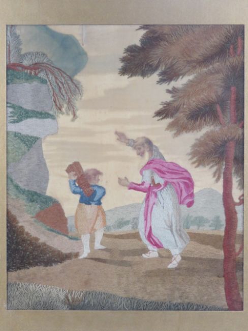 A late 18thC painted silk and wool embroidery depicting a man directing a child carrying a bale of straw, rural scene. 31 x 37.5cm, mounted in gilt frame.