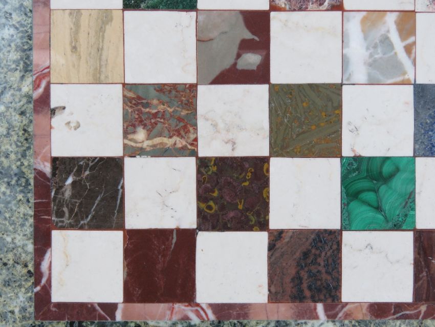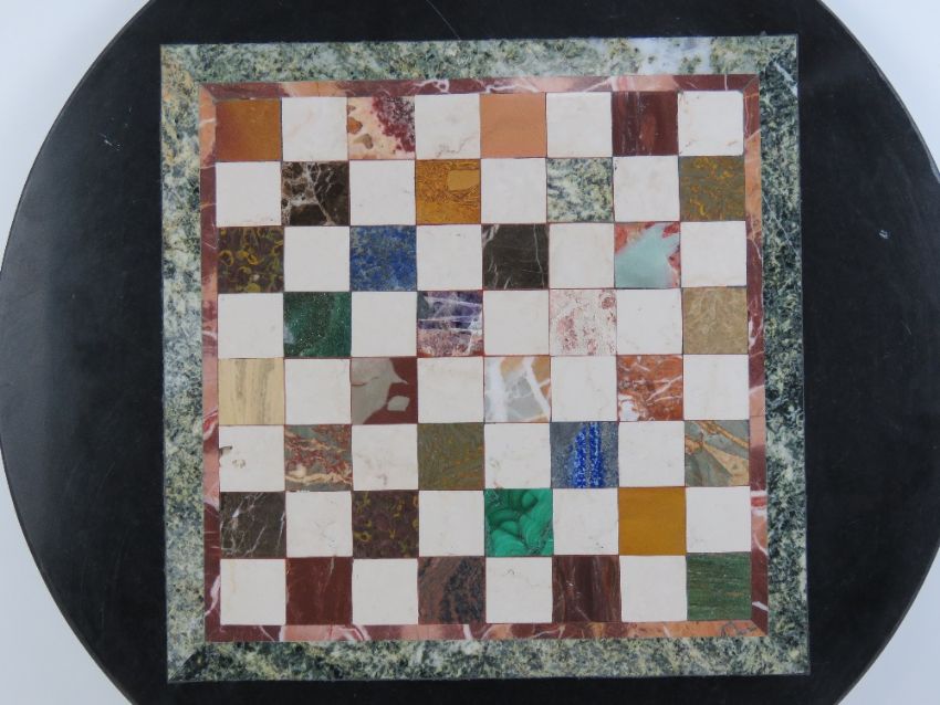 A circular Pietra Dura tabletop having inlaid marble and hardstone specimens in the form of a chess board, 66cm dia.