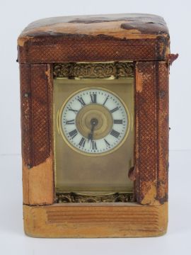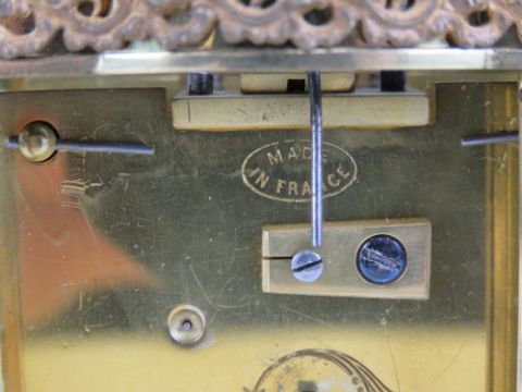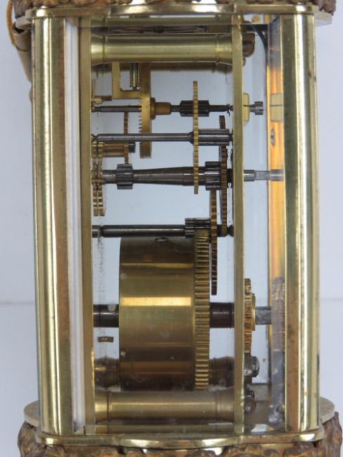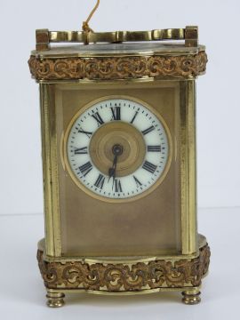 A fine five glass French made carriage clock enamelled chapter ring with Roman numerals, blue steel hands, complete with double ended key and original case (case a/f) standing 16cm high.