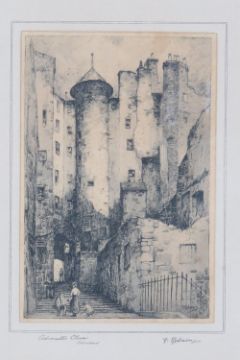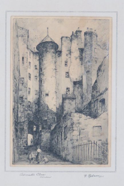 Featherstone Robson (United Kingdom, 1880-1936) three signed and entitled prints of ink sketches each being an Edinburgh street scene; 'Bakehouse Close', 'Advocates Close', and 'Whitehouse Close', each measuring 21 x 14cm.