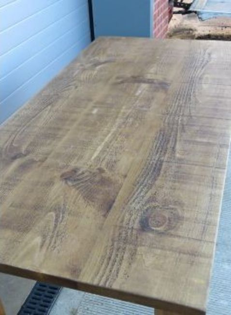 A contemporary solid pine kitchen table raised over substantial square cut legs, 6ft x 3ft.