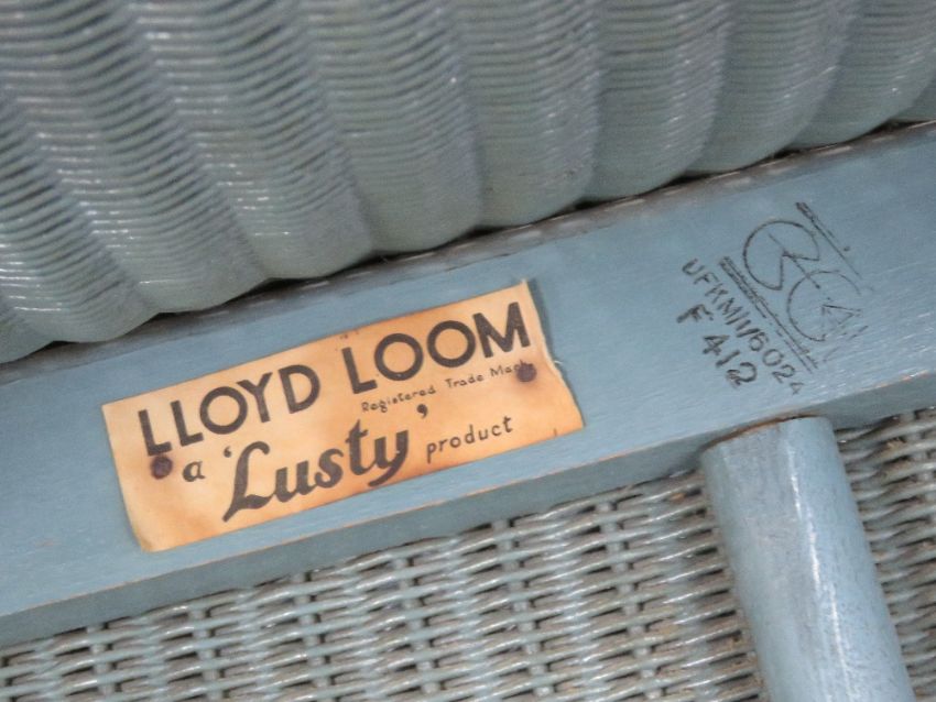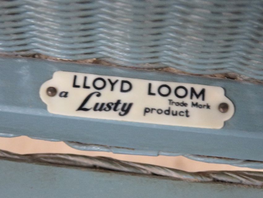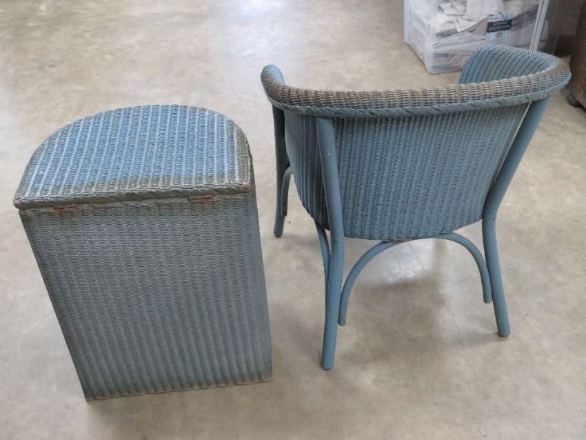 Lloyd Loom; a blue painted 'lusty' wicker bedroom set comprising chair and laundry basket. Two items.
