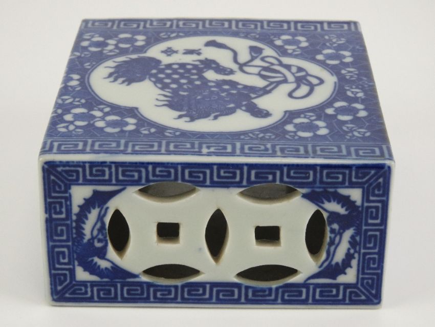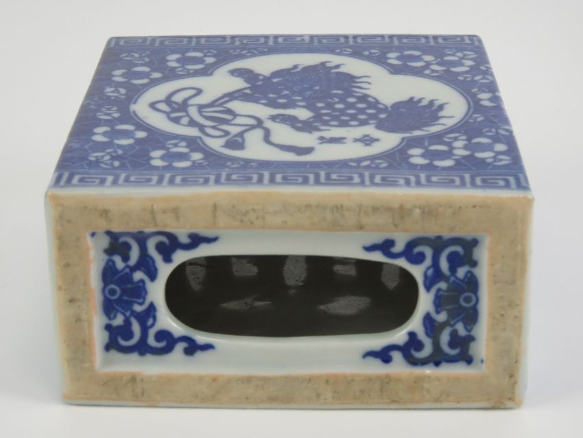 A late 19th / early 20th century opium den ceramic pillow of typical brick form with coin style piercing to one end and open to the reverse, underglaze blue Fo dogs and floral decoration, 14.5 x 13 x 6.5cm.