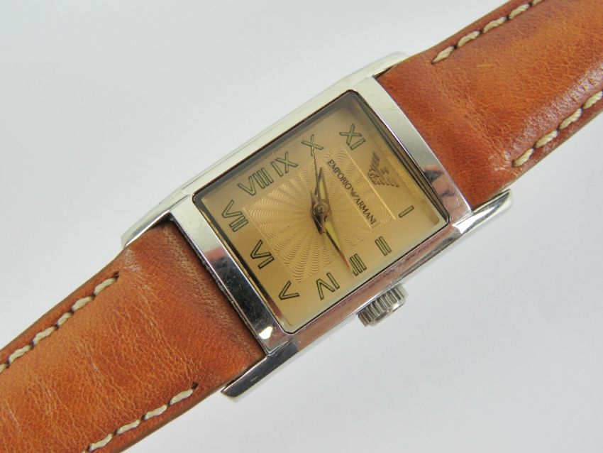 A ladies Emporio Armani wristwatch on original tan leather Emporio Armani strap.
