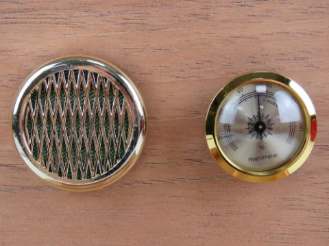 A humidor having hygrometer and internal divider, measuring 24 x 22 x 7cm.