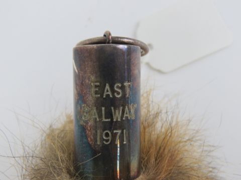 A fox brush bearing nickel plated brush stop with hanging loop marked East Galway 1971.