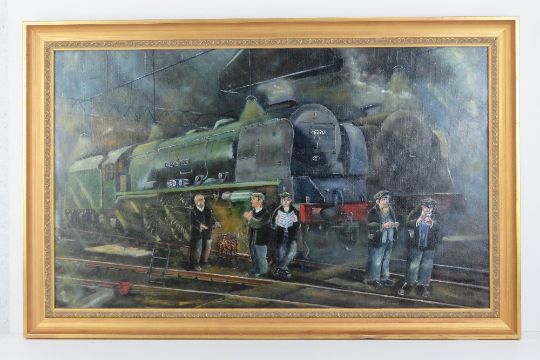 Oil on canvas on board; study of Princess Coronation locomotive No 46220 as run by the London Midland Scottish Rail Company, loco in smoke filled shed, figures before with brazier, loco beyond with lights over etc, signed lower right K Adams, c1960s within modern frame. 47 x 78cm.