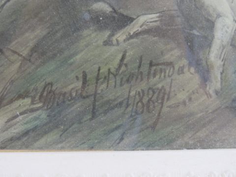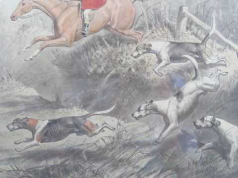 Basil Nightingale (British, 1864-1940) watercolour; huntsman vaulting a ditch, hounds beside, signed lower middle right Basil Nightingale 1889, 39 x 49cm.