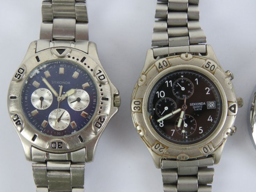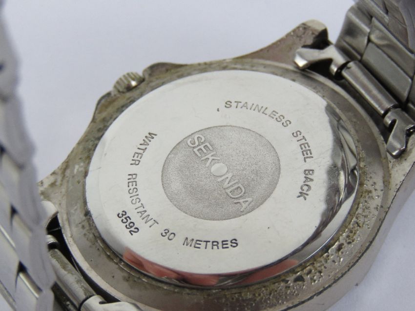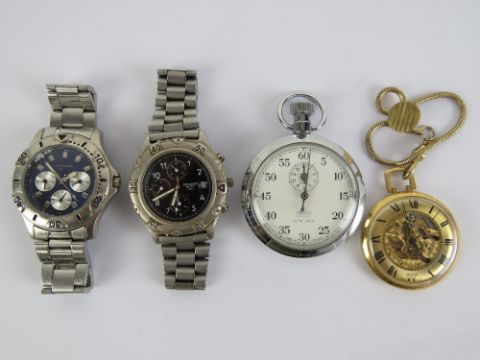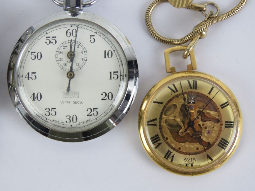 Two Sekonda stainless steel watches, one having black dial, one with blue dial a/f. Also a Smiths stop watch and an Avia skeleton dial pocket watch. Four items.