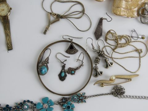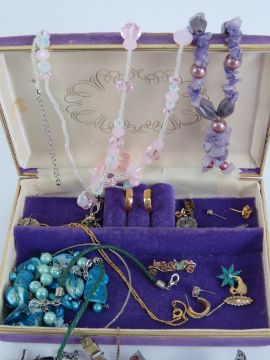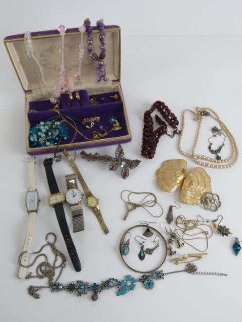 A quantity of assorted jewellery within purple velvet jewellery box includes some single silver earrings, watches, necklaces, etc.