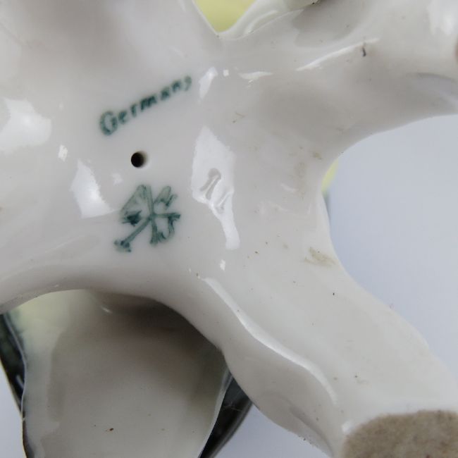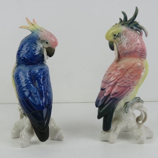 A pair of German made ceramic Cockatiels each measuring 18cm in hight, one a/f.