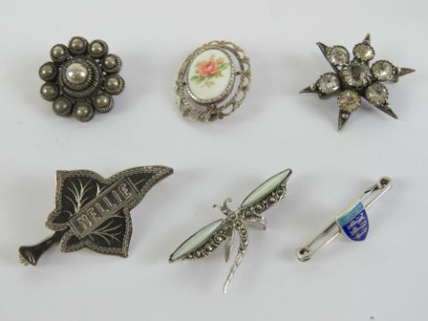 An enameled HM silver Jersey pin, together with 925 silver and marcasite dragonfly brooch, an ivy leaf brooch marked 'Nellie', and three other white metal brooches. Six items.
