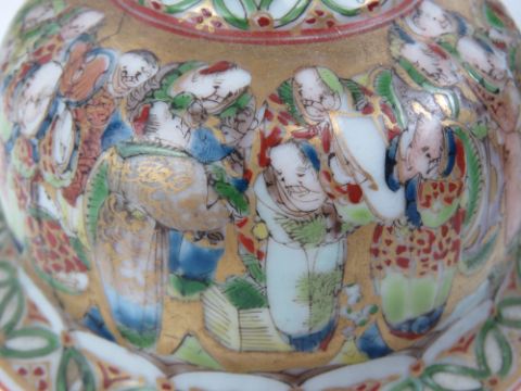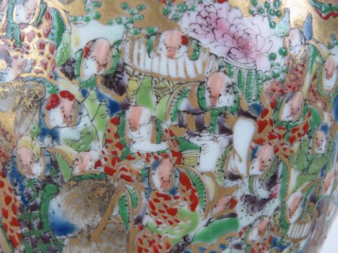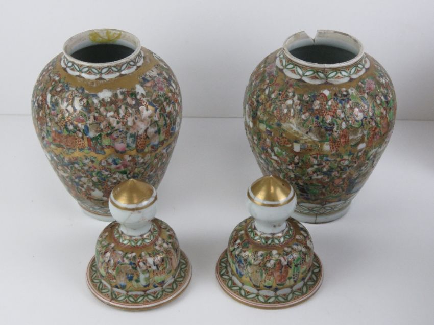 A pair of 19th century lidded ginger jars, each being gilded on cream ground and profusely decorated with figures upon, each standing 31cm high, a/f.
