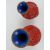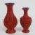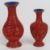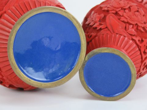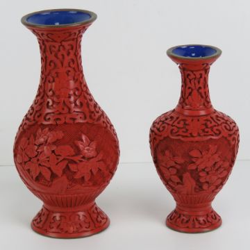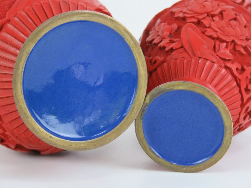 A graduated pair of Chinese carved red cinnabar and blue enamel vases, 15.5 and 13cm high respectively.