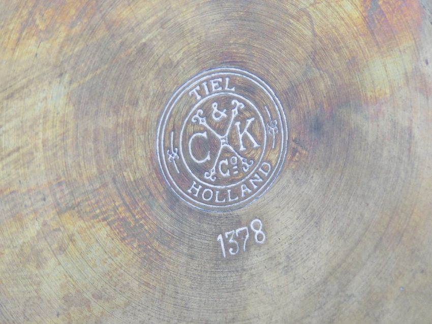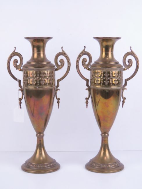 A pair of Art Nouveau tall brass urn style vases each marked C & K Co Tiel Holland 1378 to base. Each standing 36.5cm high.