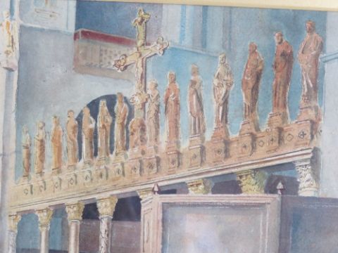 Watercolour; Russian Orthodox Church, pulpit rood screen etc, 40 x 50cm.
