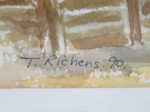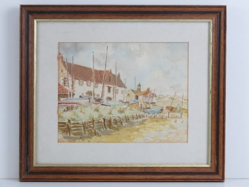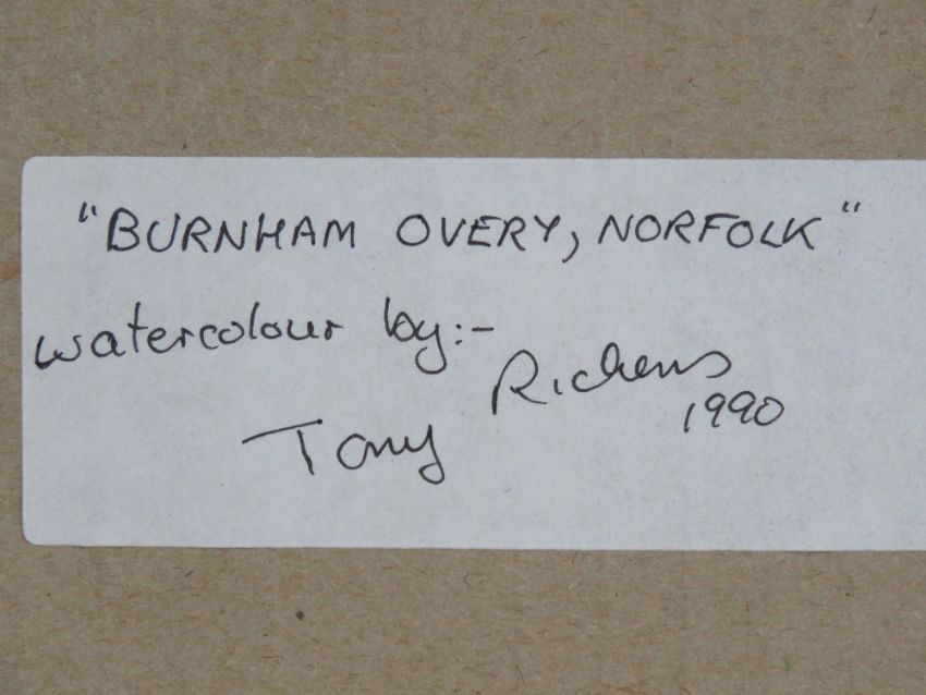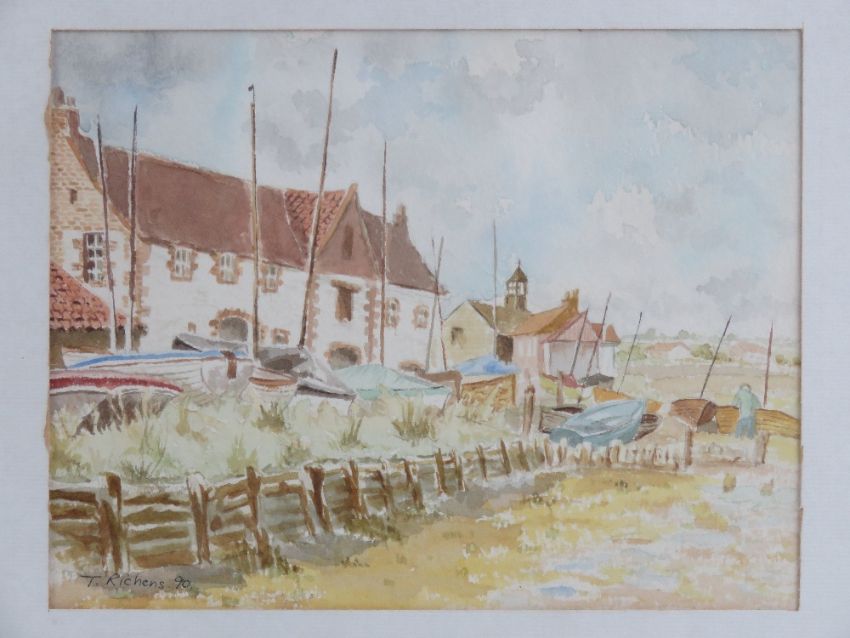 Watercolour; seaside scene Burnham Overy, Norfolk, fishing boats on grassy verge, houses beyond, signed T Richens 90 (Tony Richens 1990), 22 x 17.5cm.