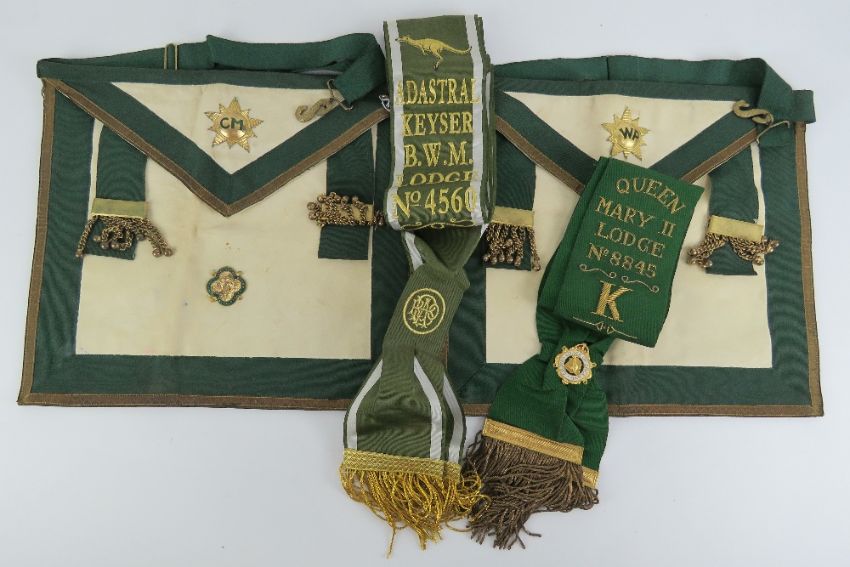 The Royal Antediluvian Order of Buffaloes (RAOB); A green fabric sash for Queen Mary II lodge No.8845 made by L Simpson Ltd, together with a sash for Adastral Keyser B.W.M. lodge No.4560. Also two aprons being CM & WP respectively. Four items.