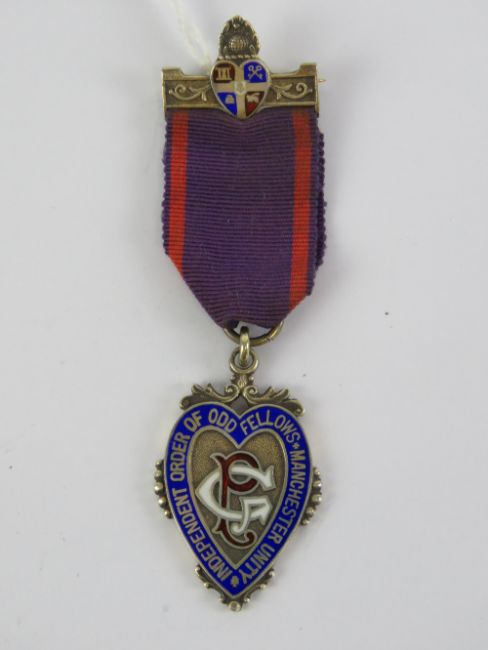 Independent Order of Odd Fellows Manchester Unity; a HM silver and enamel jewel medal with ribbon 'presented to Sister Edith Martin PG by Director E. Heather GM...1929', jewel hallmarked London, bar marked sterling silver.