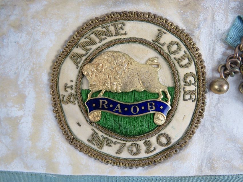 The Royal Antediluvian Order of Buffaloes (RAOB); Five ROH lambskin aprons, one for Silver Jubilee Lodge No.7315,one for Proud Hearts of Oak Lodge No.9729 and one for St Anne Lodge No.7020, one bearing label for L Simpson & Co, one bearing label for F C Parry.