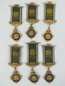 The Royal Antediluvian Order of Buffaloes (RAOB); six c1949-1968 GLE Grand Lodge of England jewel medals with ribbons. Being William Wilberforce Lodge No8122, Donside Lodge No7930, Stopaley Lodge No7963, Noyna Lodge No8118, Scorpion Lodge No8351, and King George VI Lodge No8544.